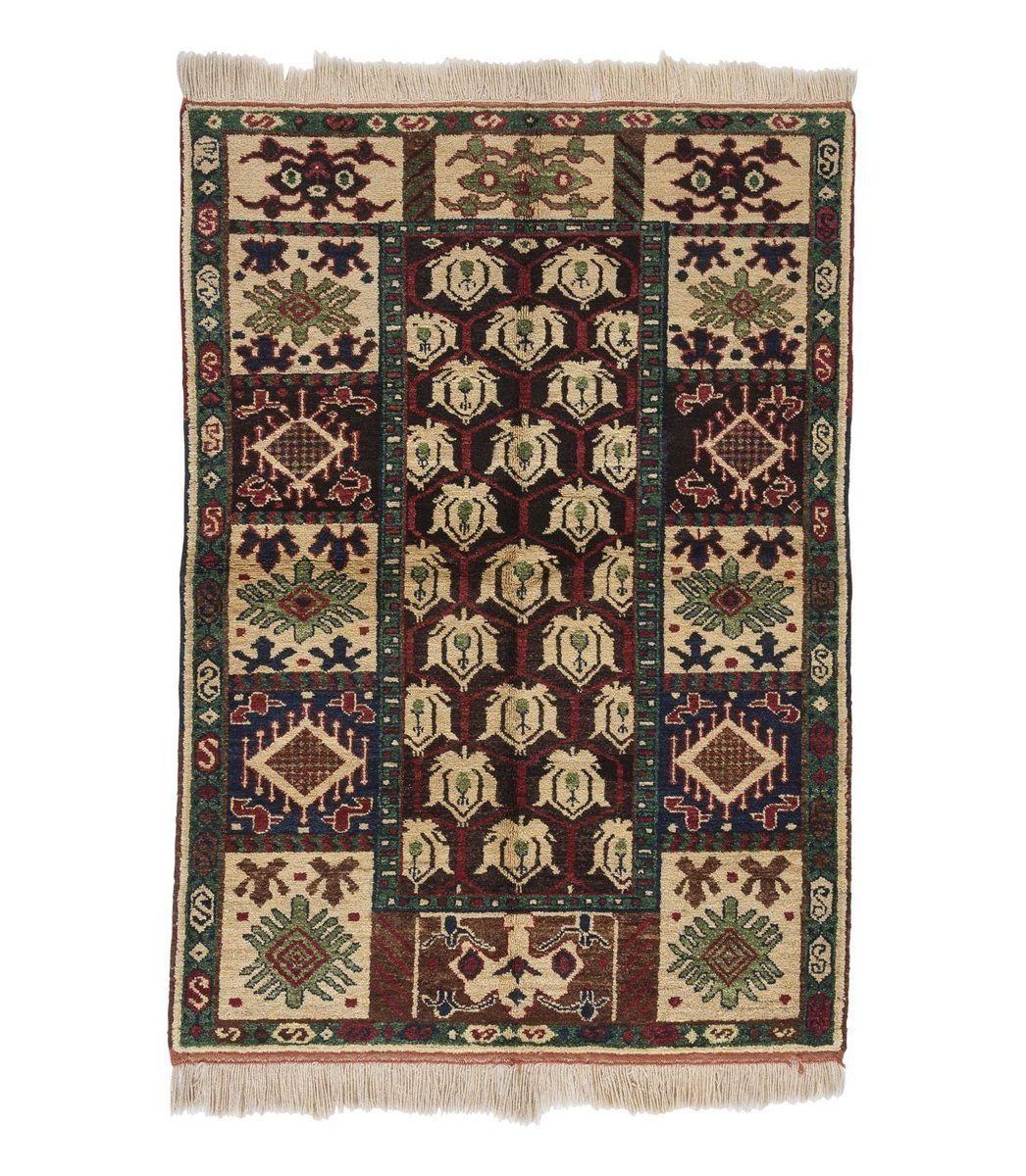 This 4x6 Kazak rug features a field of stylized tulips surrounded by other Kazak iconography.