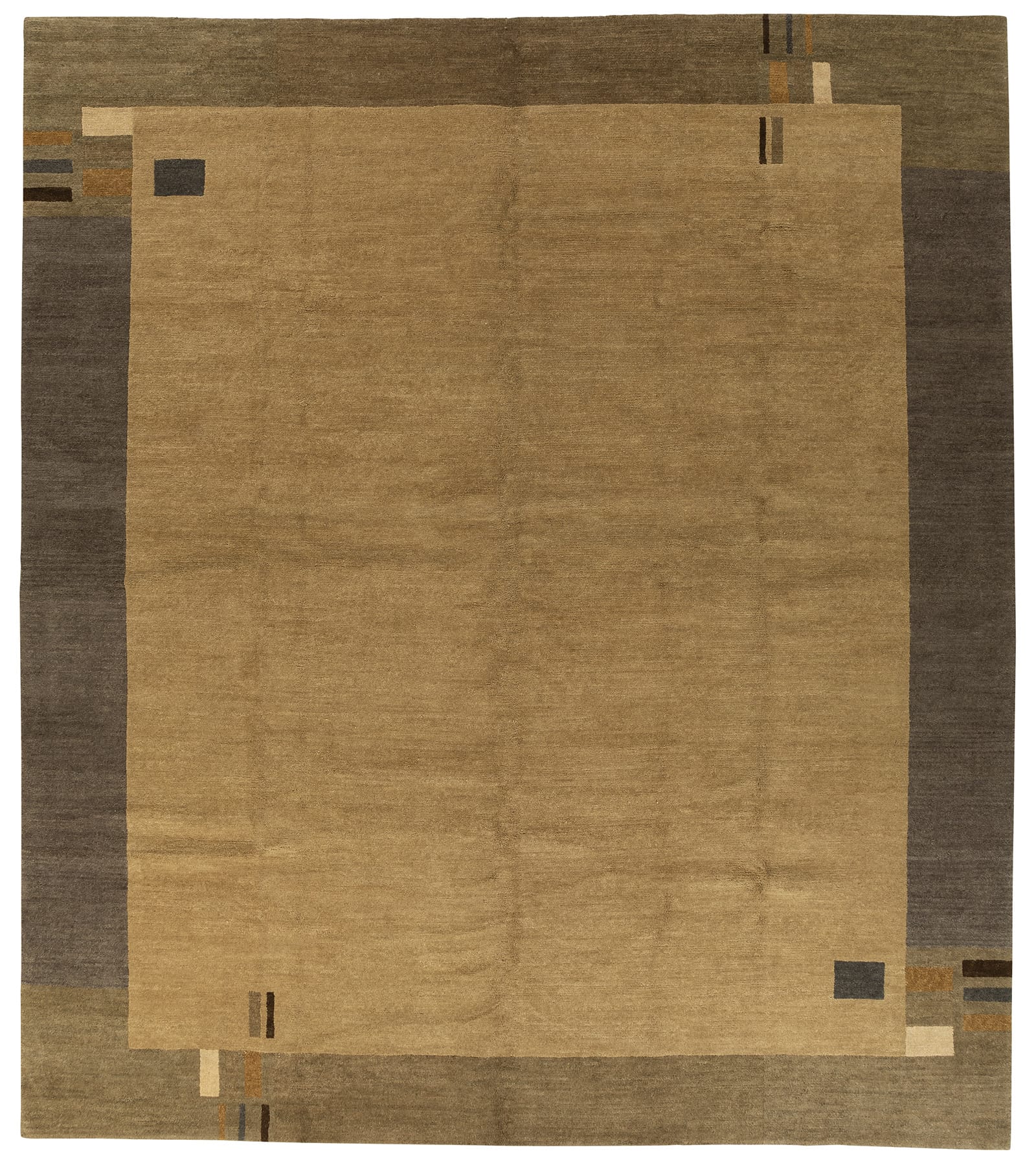 A geometric border print Shakti weave rug in beige. Inspired by the Prairie Style of Frank Lloyd Wright, the Kensington design features a border print whose geometric shapes are set off by a touch of levity. Kensington Custom Rug Color was hand-knotted in Nepal of 100% Himalayan wool using our Shakti weave which has a pile height of about 0.28 inches. The Kensington design incorporates natural inspired colorways which interact well with furniture in a room. Kensington Custom Rug III has a wheat colored field with a border of geometric shapes in warm grey, umber, butterscotch and sierra brown.
