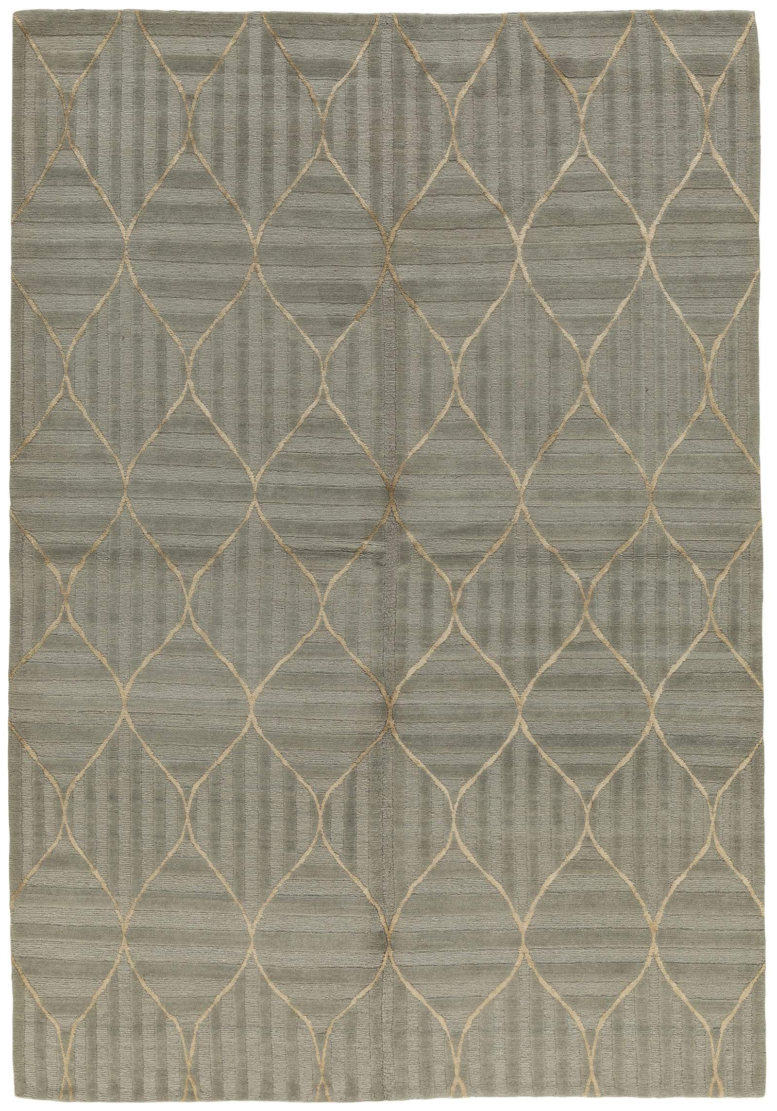 This classic Mark Pollack design features a background of grey squares and stripes interspersed with an overlay of gold lattice. Hand knotted in Nepal of hand spun Tibetan wool and silk.