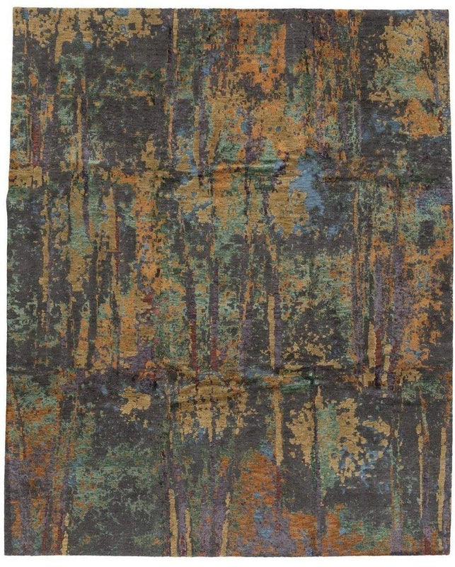 Luminance reveals an artfully reimagined use of color and texture, redolent of oxidized metal. Abstract design finely illustrated in hand carded, hand spun Himalayan wool, linen, and silk. Handcrafted with a Tibetan weave that features mixed piles of purple, gold, peanut, tan, aqua, rust and black, alternating pile heights, the design an exemplary work of contemporary design. This wool and silk one of a kind version of Luminance is available only in 8x10.