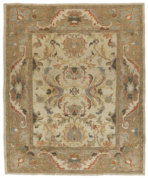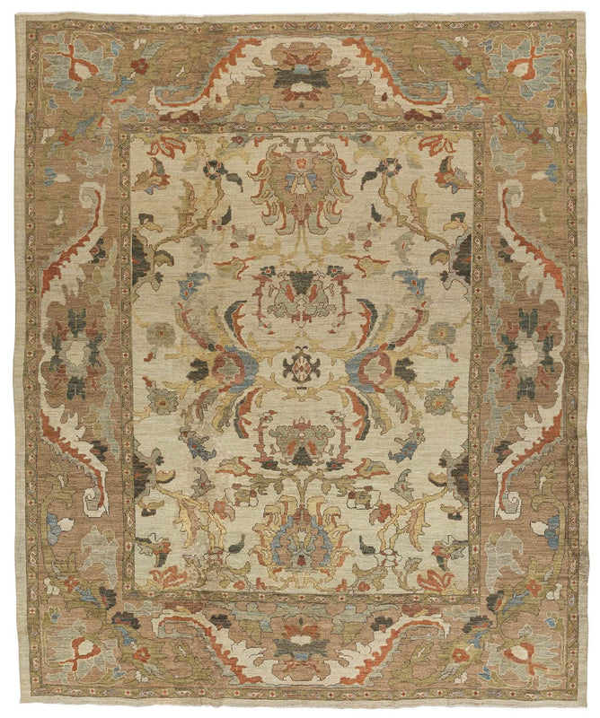 This Mahal inspired design is a classically beautiful traditional handmade rug that will last and be cherished for generations. The design features a symmetrical, abstract floral pattern with blossoms connected through a network of vines and stylized leaves. This one of a kind heirloom quality rug was handcrafted in India of 100% wool. This colorway features light and dark beige, wheat tones, shade of orange, light blue and sage green.