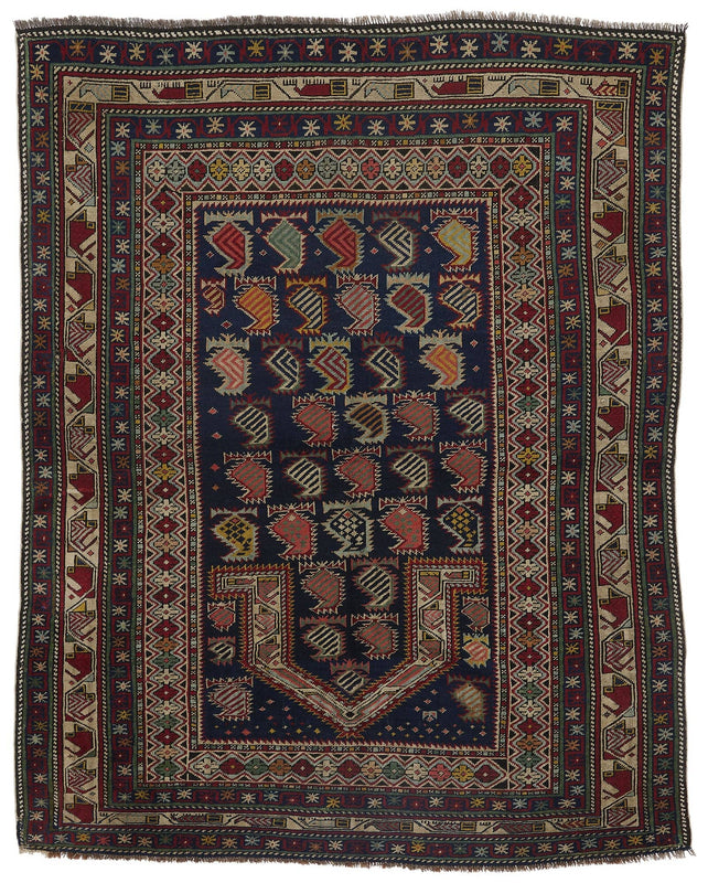 This MARASALI ANTIQUE PRAYER RUG 3'10" X 4'11" features a vibrant, intricate mix of dragons, Botehs (paisley), and cross motifs in colors of crimson, rose, rust, navy blue, black, tan, cream, yellow gold, pale blue, pine green, and mint. Constructed over a century ago, this antique woolen piece is sure to add elegance and character to any space.