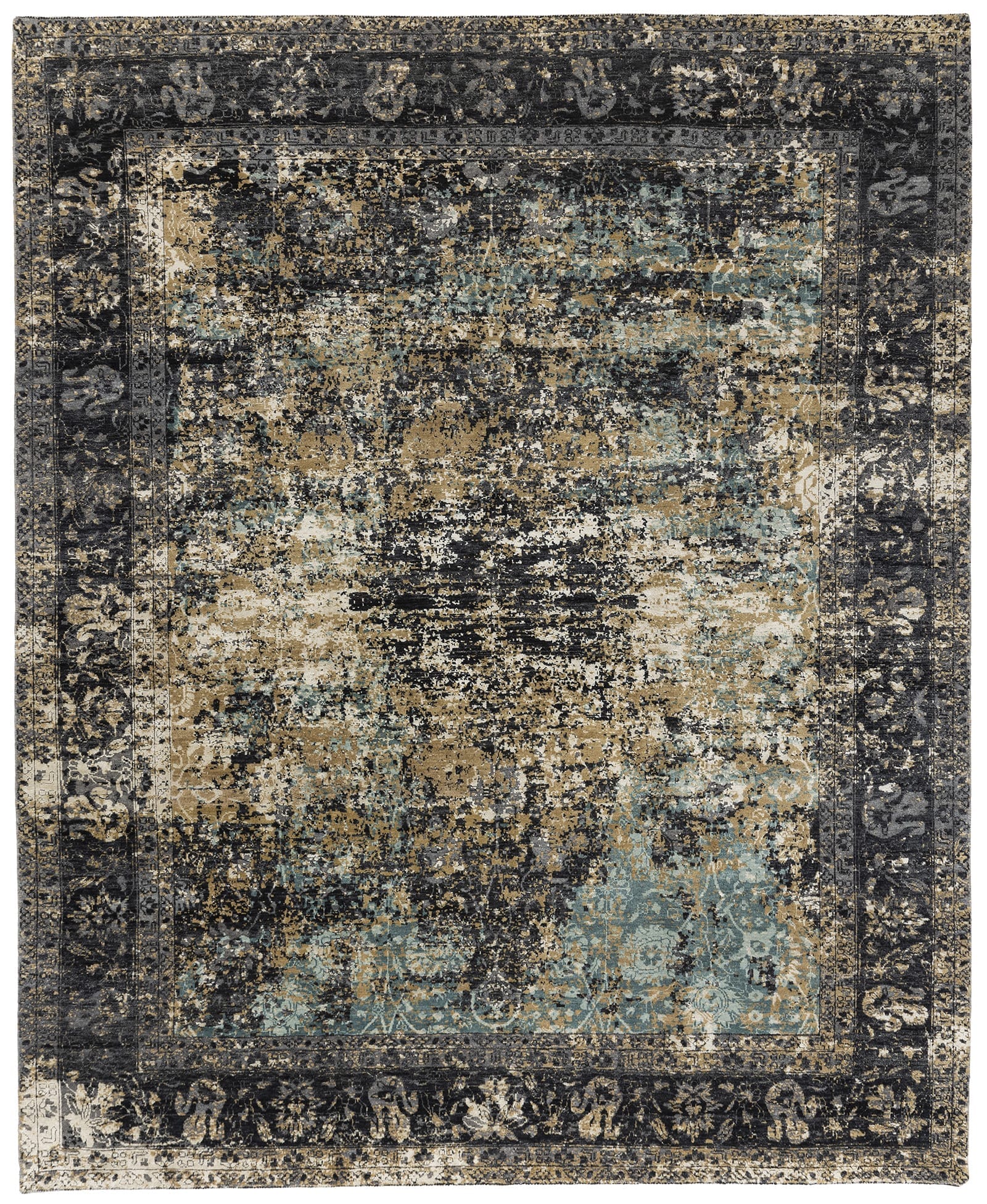 Hand-knotted with luxurious wool and silk, the Mira Charcoal Turquoise rug features a distinctively distressed traditional pattern and a blend of neutrals enriched with highlights of gold and turquoise, creating a timeless piece of artful refinement. Mira Charcoal Turquoise is available in our standard room sizes; custom sizes, runners, squares and rounds available. Our rugs are normally available for delivery within 10 to 90 days. Contact us or Request a Quote for timing on the rug and size of your choice.