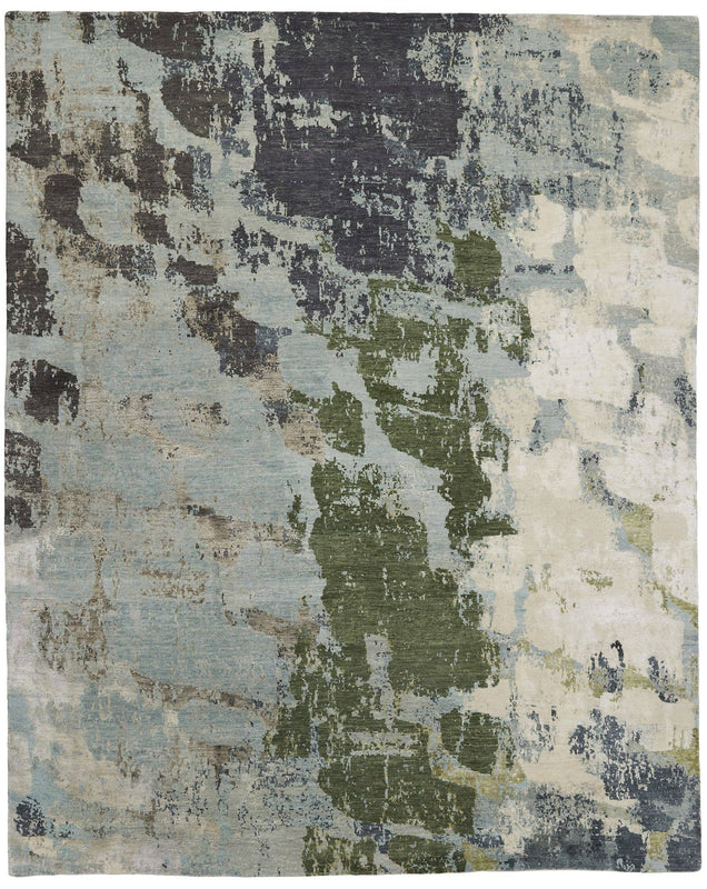 Create a unique interior space with the MONTAGUE SLATE MOSS 8 X 10 rug. This wool production sample features a painterly abstract pattern in gunmetal, soft blues, moss, taupe, greys, beige, and loden, making it ideal for modern and contemporary décor styles. Handcrafted in India, this rug is sure to make a statement in any room.