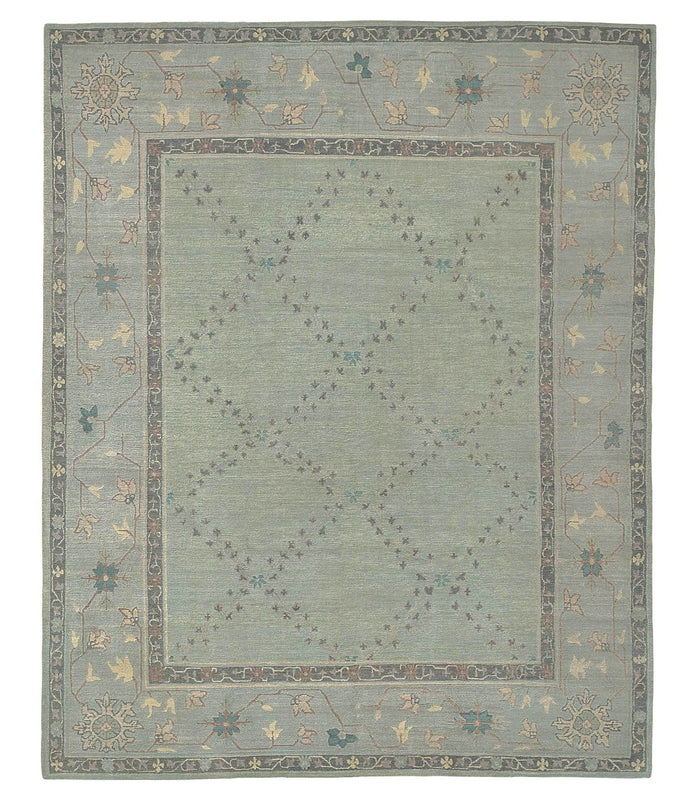 A border rug with a center trellis that supports a vine pattern, Montrose Blue Mist is a garden for your floors.