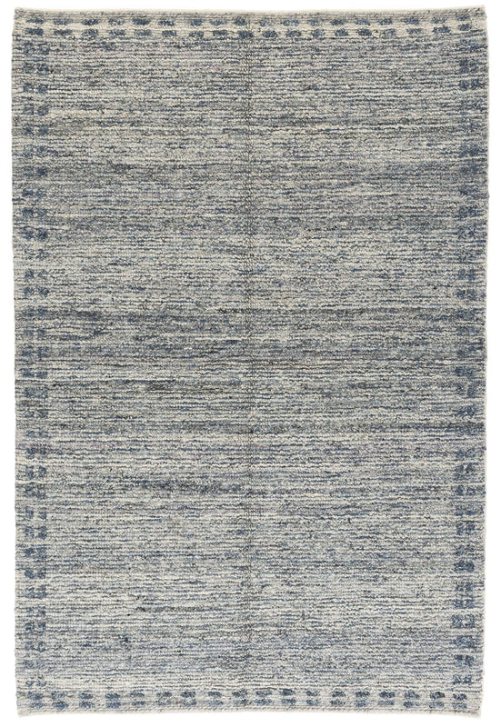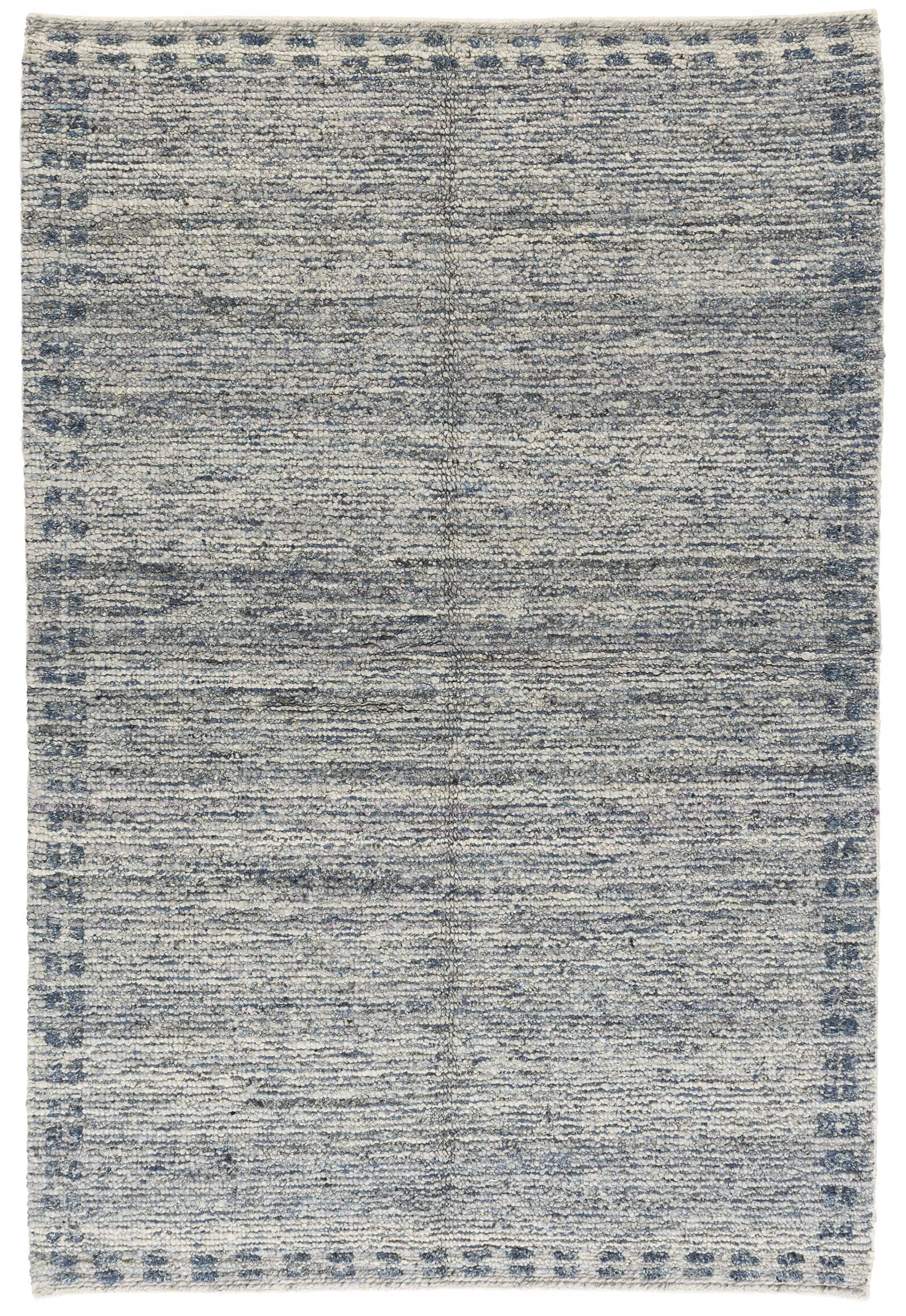 Pebble Beach is a hand knotted rug crafted in 100% wool with a looped pile design. This versatile piece features a beautiful strie and a soft blend of cream, blues, and light grays. This 5' 6" by 8' 6" rug offers a textural alternative to sisal or jute. Exceptionally crafted, Pebble Beach is the perfect choice for an elegant, timeless look.