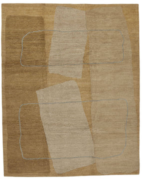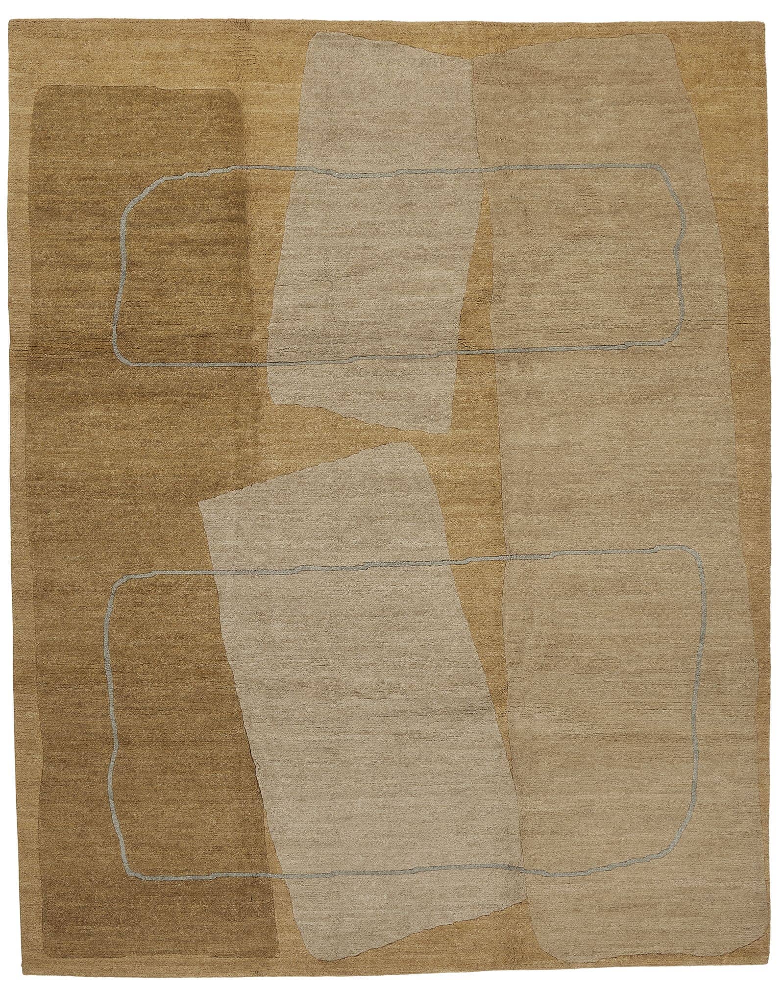 Quiet idea for the modernist home, the all wool PEDESTAL SUNDIAL 8 X 10 rug is a statement piece, hand-knotted in neutral and natural un-dyed wool yarns, with colors of golden browns, tan, taupe, and grey. Compare with Portal Wintermoon.