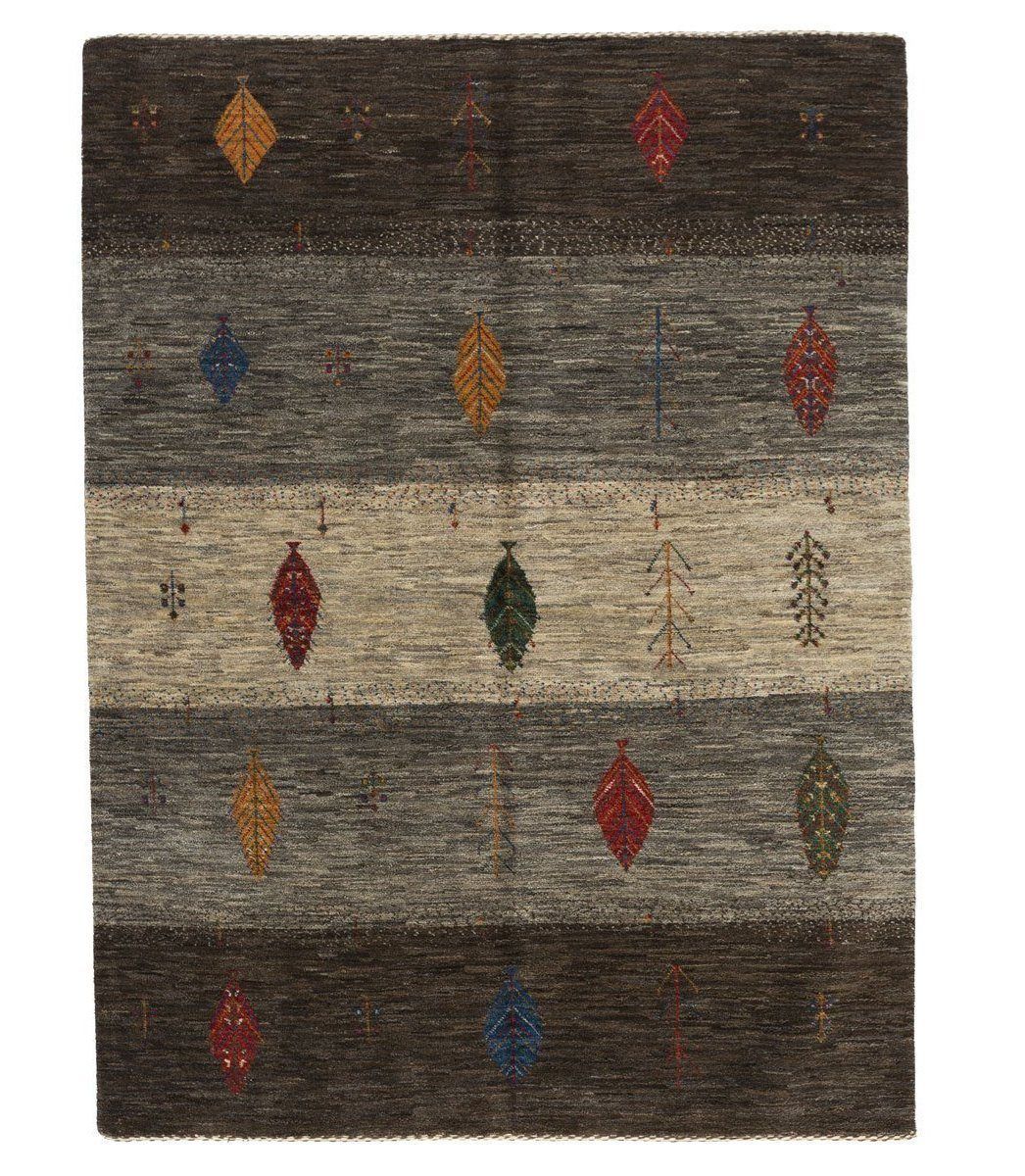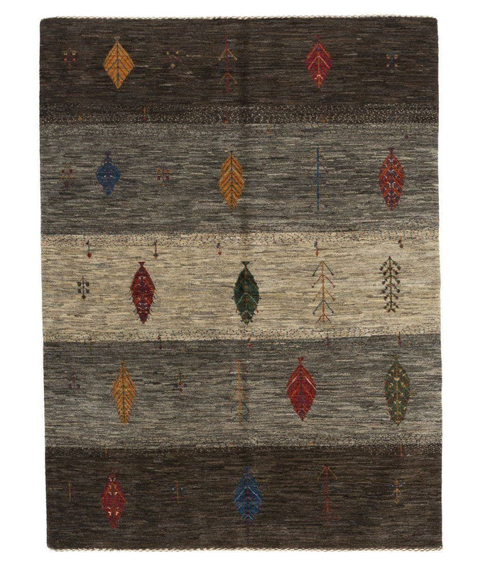 This Persian gabbeh was hand knotted using Persian wool that has been dyed using vegetable dyes. Its tribal design features renderings of the Tree of Life. This one-of-a-kind piece measures 4'11" x 6'6".