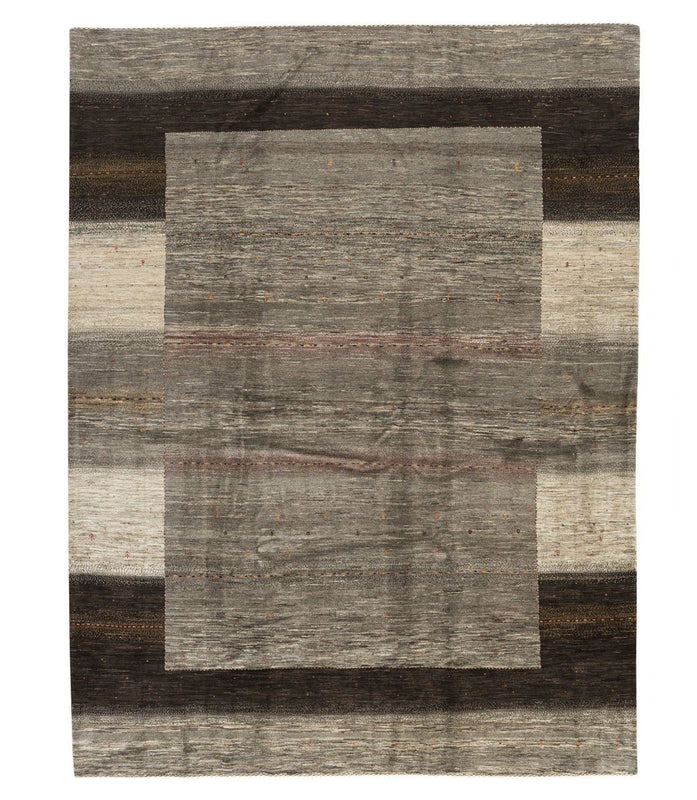 This room-sized Persian gabbeh was hand knotted using natural, unbleached wool and vegetable-dyed wool. This one-of-a-kind piece measures approximately 9' x 12'.