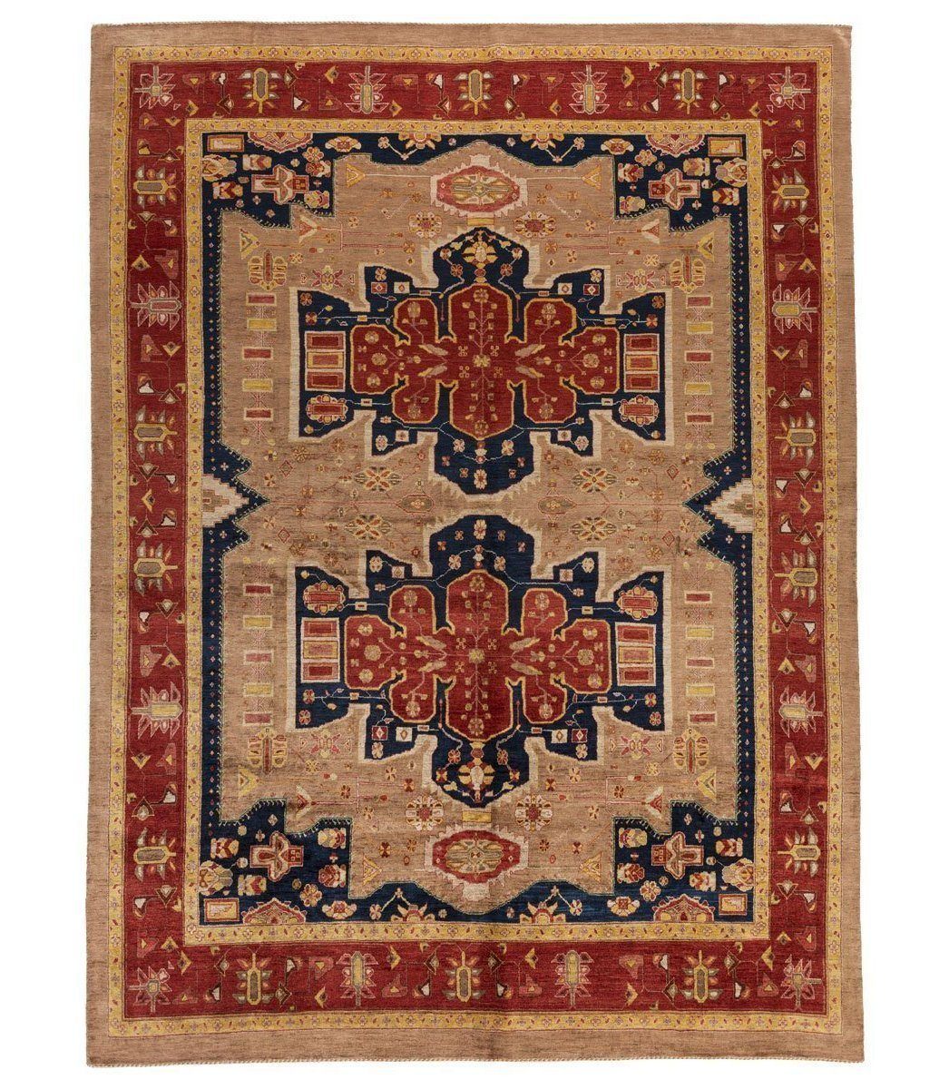 This piece measures 9' 8" x 13' 1", and was chosen by James Tufenkian for its unique design and vibrant colors. This gabbeh rug is hand knotted of 100% wool that has been vegetable dyed.