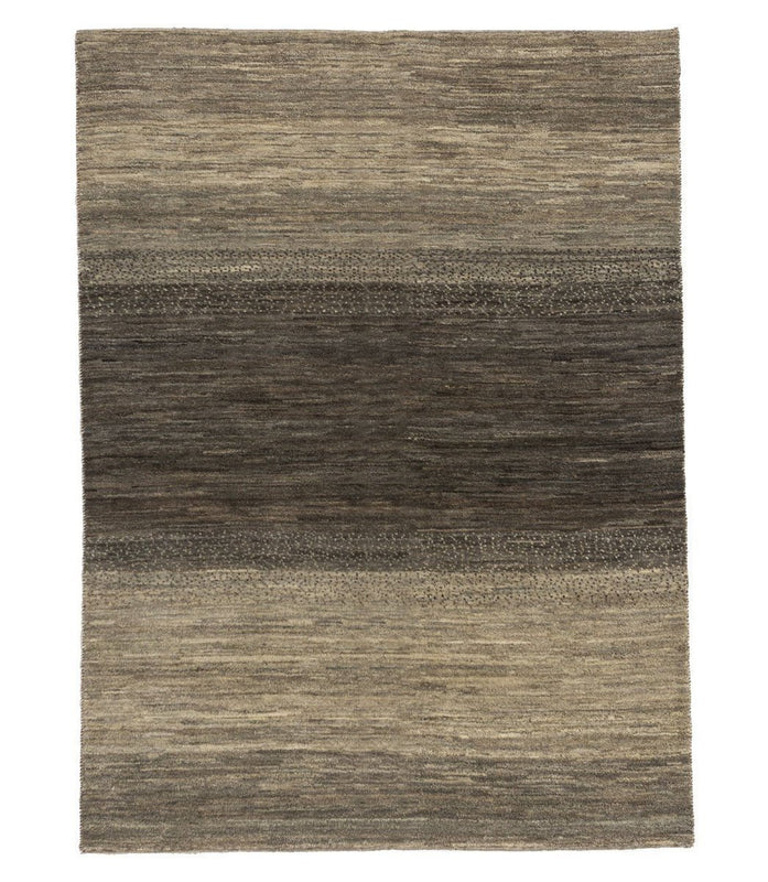 This room-sized Persian gabbeh was hand knotted using natural, unbleached wool and vegetable-dyed wool. This one-of-a-kind piece measures approximately 4'11"x 6'7".