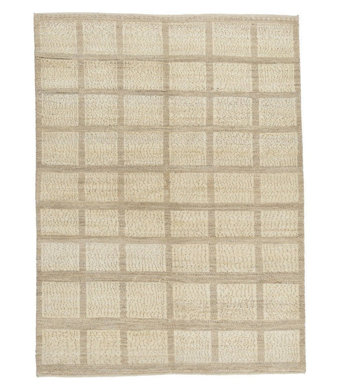 This room-sized Persian Gabbeh was hand-knotted using natural, unbleached wool. This one-of-a-kind piece measures 5' 0" X 6' 8".