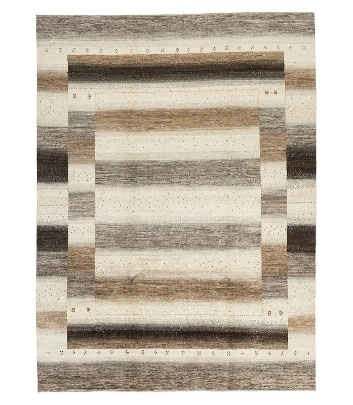 This room-sized Persian gabbeh was hand knotted using natural, unbleached wool in an ombre pattern. This one-of-a-kind piece measures 7'11" x 10'8".