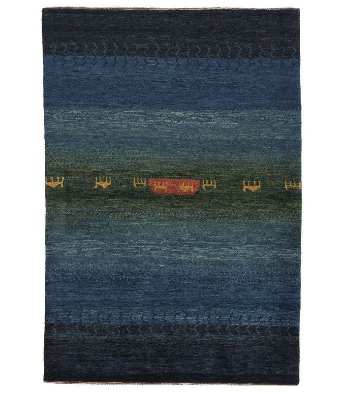 This Persian gabbeh rug was hand knotted using 100% wool. This one-of-a-kind piece measures 3' 5" x 5' 1".