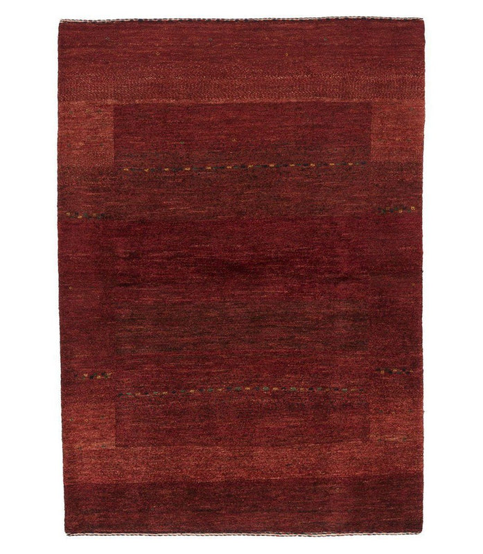 This Persian gabbeh was hand knotted using 100% Persian wool that has been dyed using pure vegetable dyes. This one-of-a-kind piece measures 3'2" x 4'5".