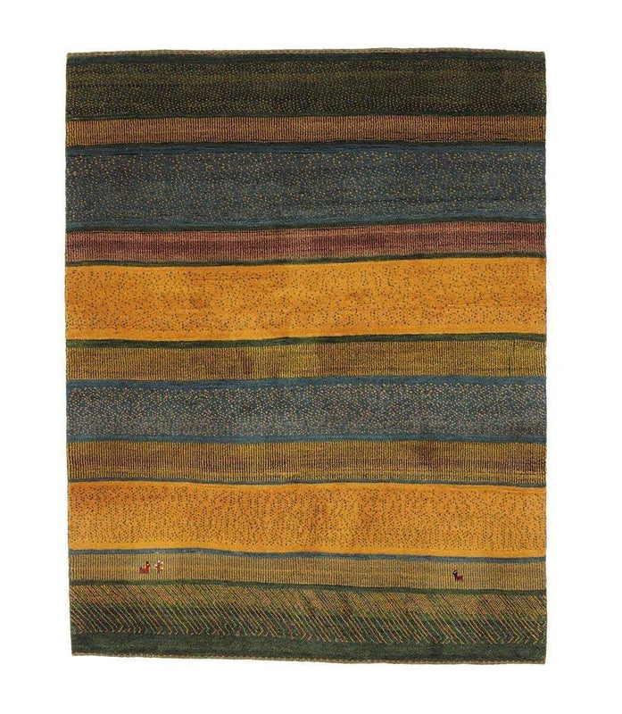 A one-of-a-kind piece, this Persian gabbeh is woven using 100% Persian wool. Its striated color field includes a whimsical representation of camels and the Tree of Life, both signs of prosperity and longevity.