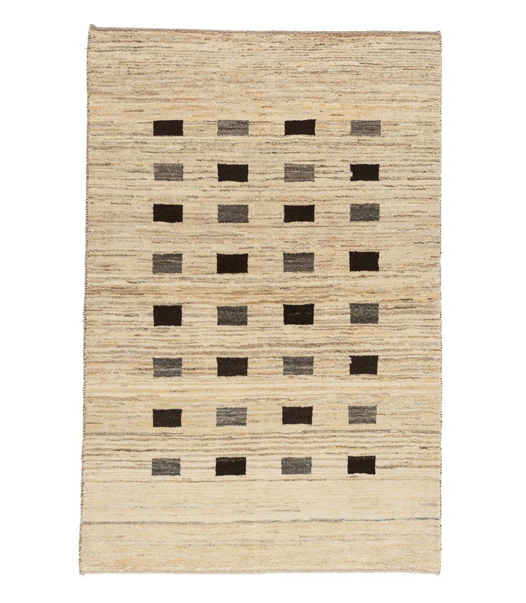 A hand knotted carpet made with undyed and unbleached Persian wool, this one of a kind gabbeh rugs measures 3' 3" x 5' 0".