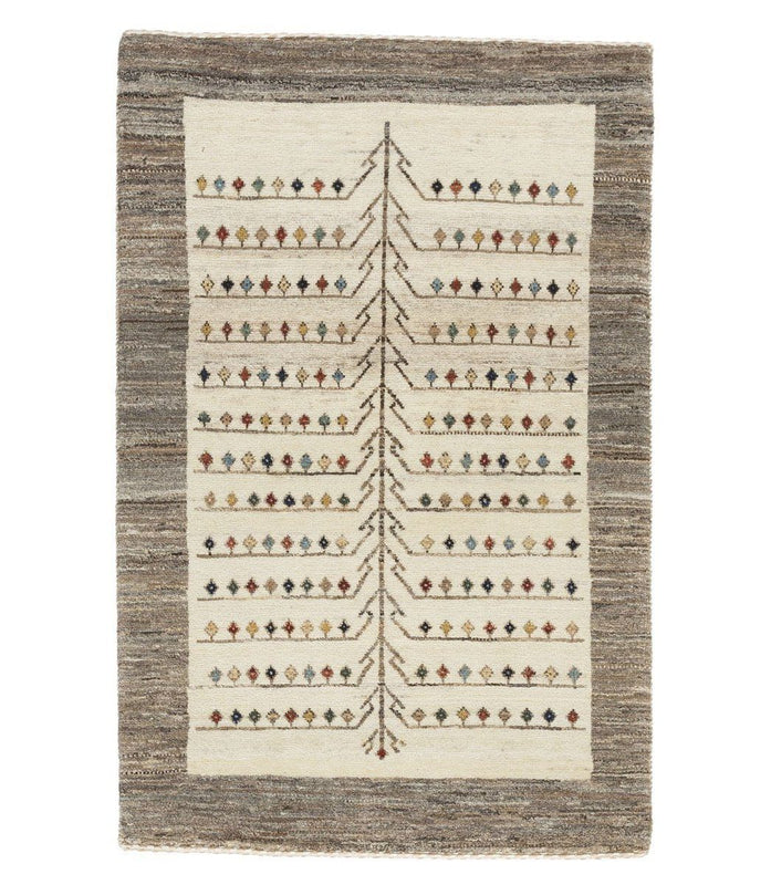 Hand knotted using unbleached Persian wool, this Persian gabbeh is a one of a kind piece featuring the tree of life motif. This special rug measures 2'6" x 3'10".