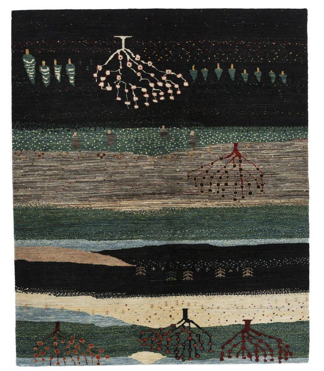 This hand knotted gabbeh is made of 100% Persian wool, known for it sheen and durability. This one-of-a-kind carpet measures 5'1" x 6'4" and features a pastoral scene complete with pomegranate and cyprus trees.