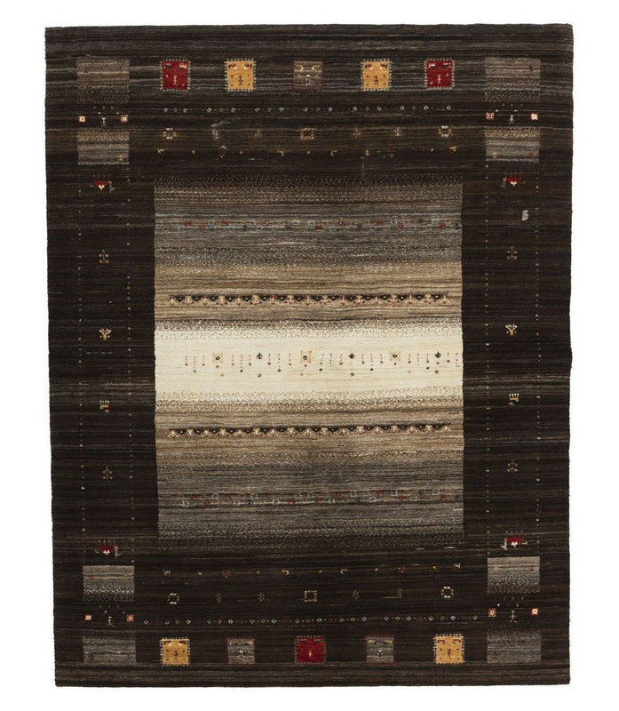 This one-of-a-kind gabbeh rug measures 4' 11" x 6' 5". It was hand knotted of 100% vegetable-dyed Persian wool.