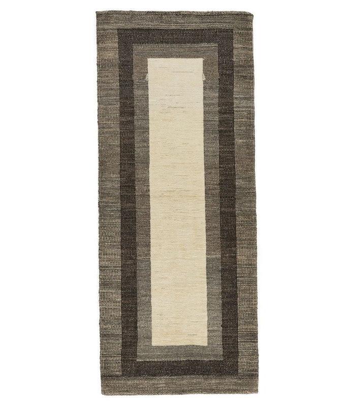 This gabbeh is a one-of-a-kind piece with a natural palette made up of undyed, Persian wool. This carpet measures 2' 9" x 6' 9", and was hand knotted of 100% wool.