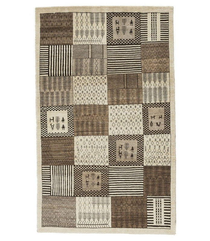 This gabbeh is a hand knotted one-of-a-kind rug that uses a traditional design motif. It is woven of 100% Persian wool, in a selection of natural tones. This carpet measures 3' 10" x 6' 7".