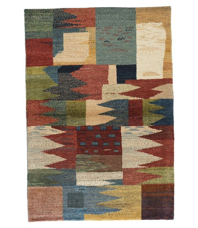 This one-of-a-kind gabbeh measures 3'5" x 4'11". Hand knotted of 100% Persian wool, this rug was carefully dyed using natural vegetable dyes.