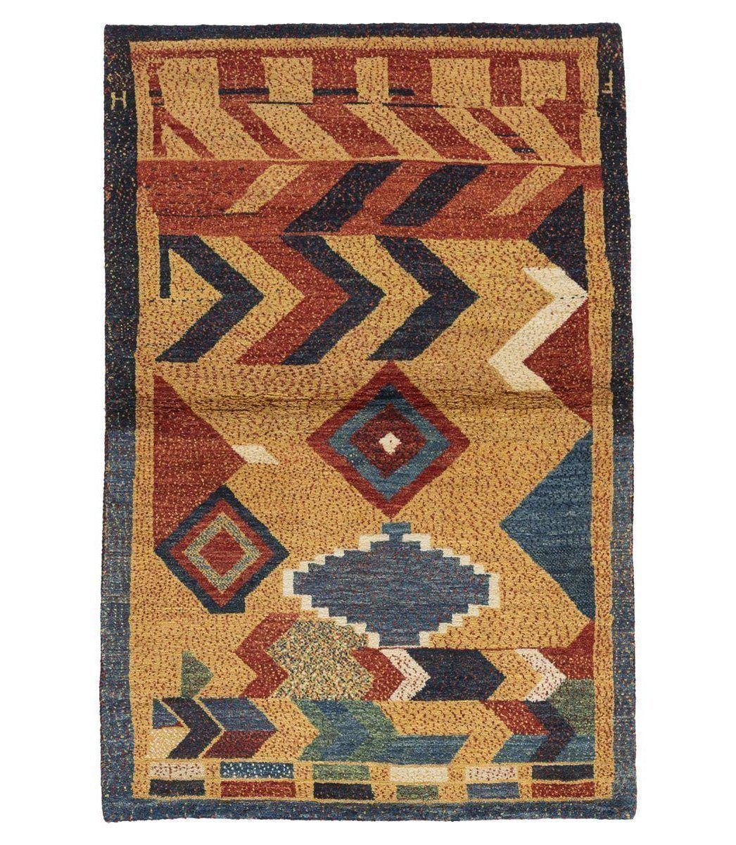 This one-of-a-kind gabbeh rug measures 3'3" x 4'10". It was hand knotted of 100% vegetable-dyed Persian wool.
