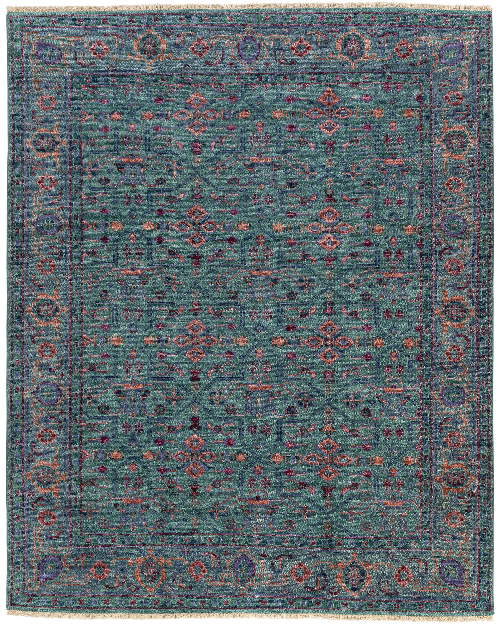 An unabashedly modern interpretation of familiar traditional designs made fresh and of this era through adroit, well composed, and somewhat unexpected youthful bohemian color palettes. With a refined balance of figurative drawing and classical elements accentuated by bold color, ROCK MY CLASSICS offers an invigorating aesthetic harmoniously suited to the contemporary maximalist. Eccentric uses of symmetry, delicately drawn motifs, and a patina echoing an aged heirloom pedigree are further enlivened via highly abashed color of delightful visual complexity. Hand knotted in India of 100% wool, Persian Lattice Spruce offers a deep blue green field accented in a vibrant fuchsia, a refreshing palette for a traditional motif.