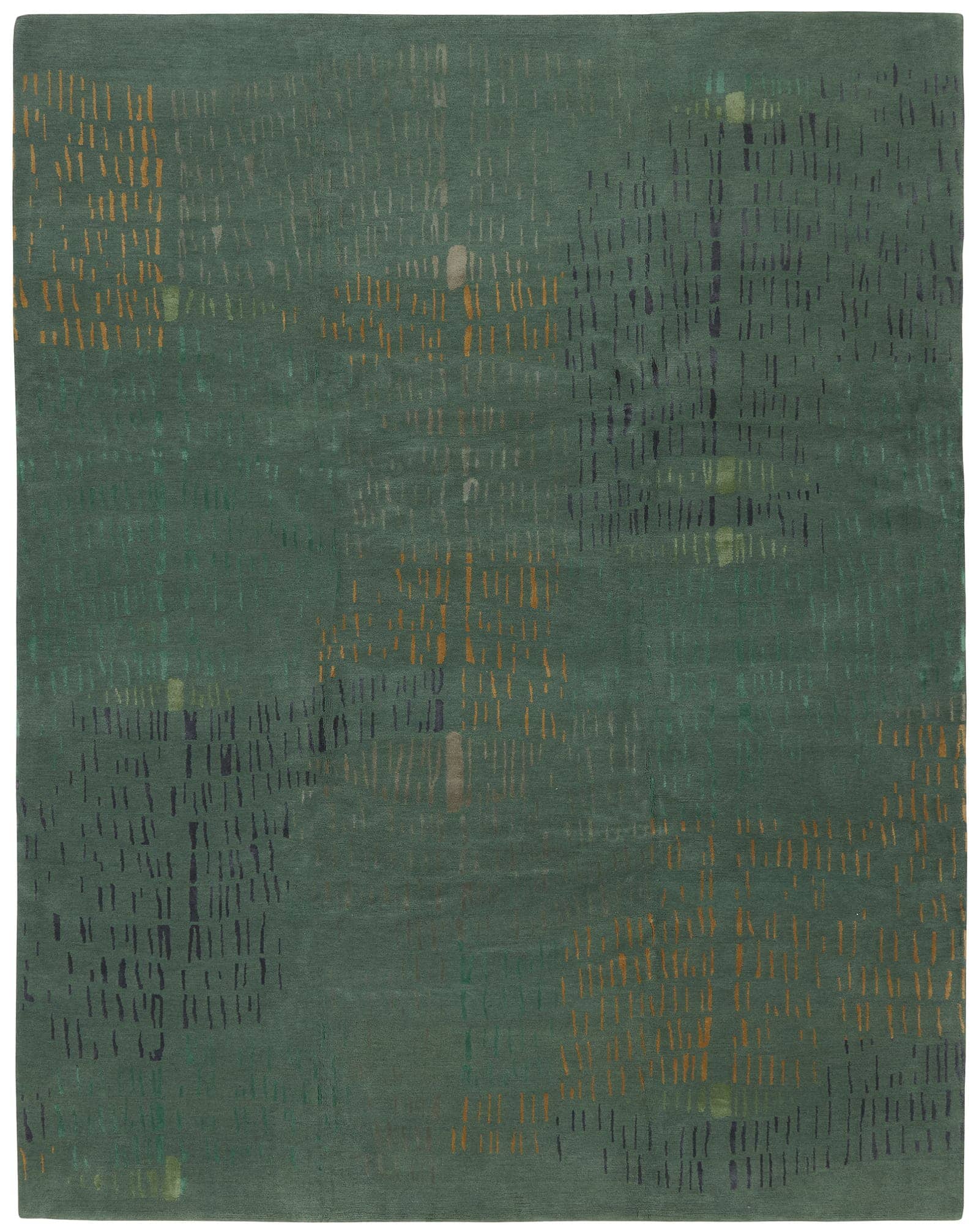 The Prati II Jade is an elegant hand-knotted rug, in a bold green wool with silk accents in brown, green, blue and orange. It is a one of a kind colorway of a Kevin Walz design, it is only available as an 8x10.
