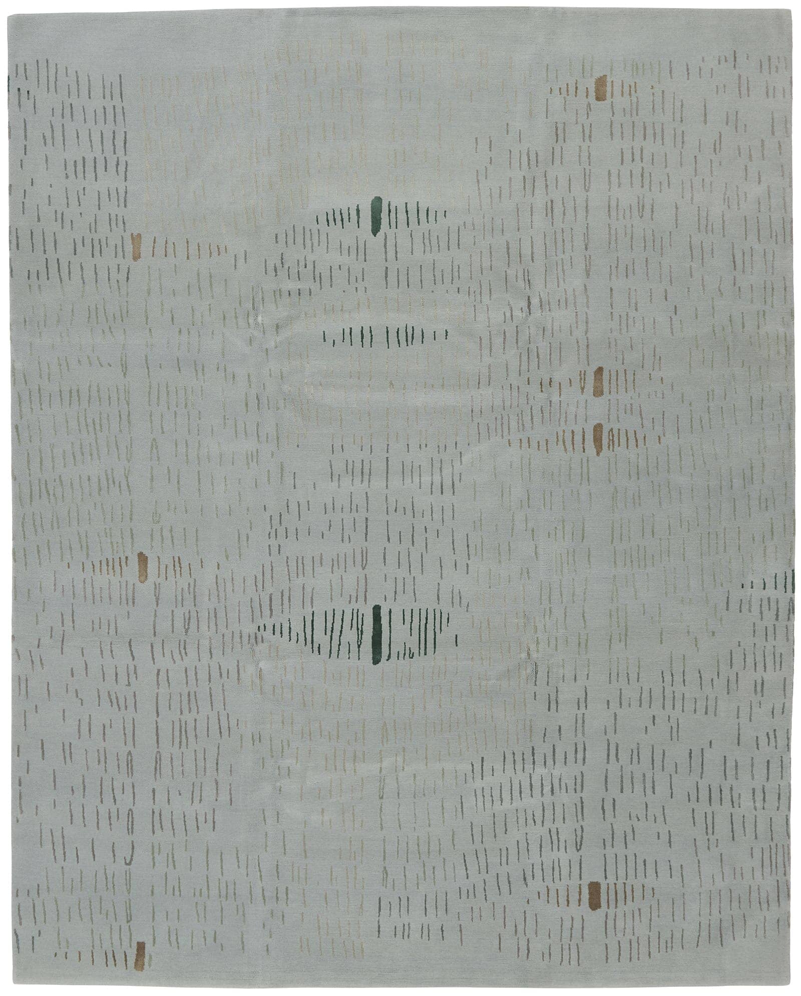 The Prati II Moondust is an elegant hand-knotted rug, in pale grey wool with silk accents in brown, green and blue. It is a one of a kind colorway of a Kevin Walz design, it is only available as an 8x10.