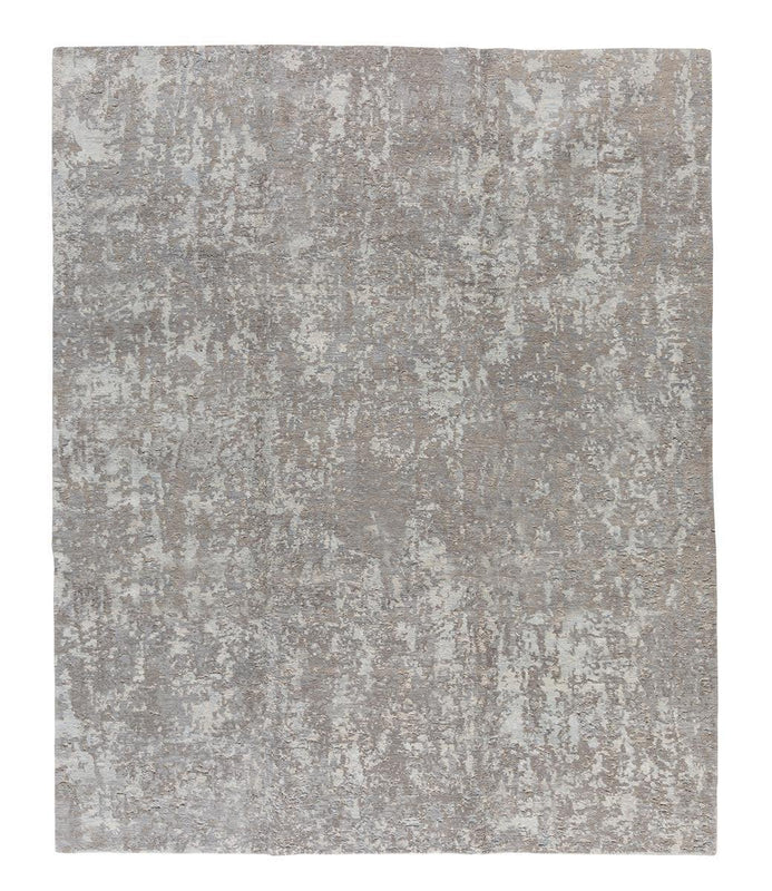 This one-of-a-kind sample is a stunning example of organic design for which Tufenkian is world renown. Rendered in a silver palette, the carpet organically transitions between tones, with shimmering silk accents. This hand knotted carpet is only available as a 2X3.