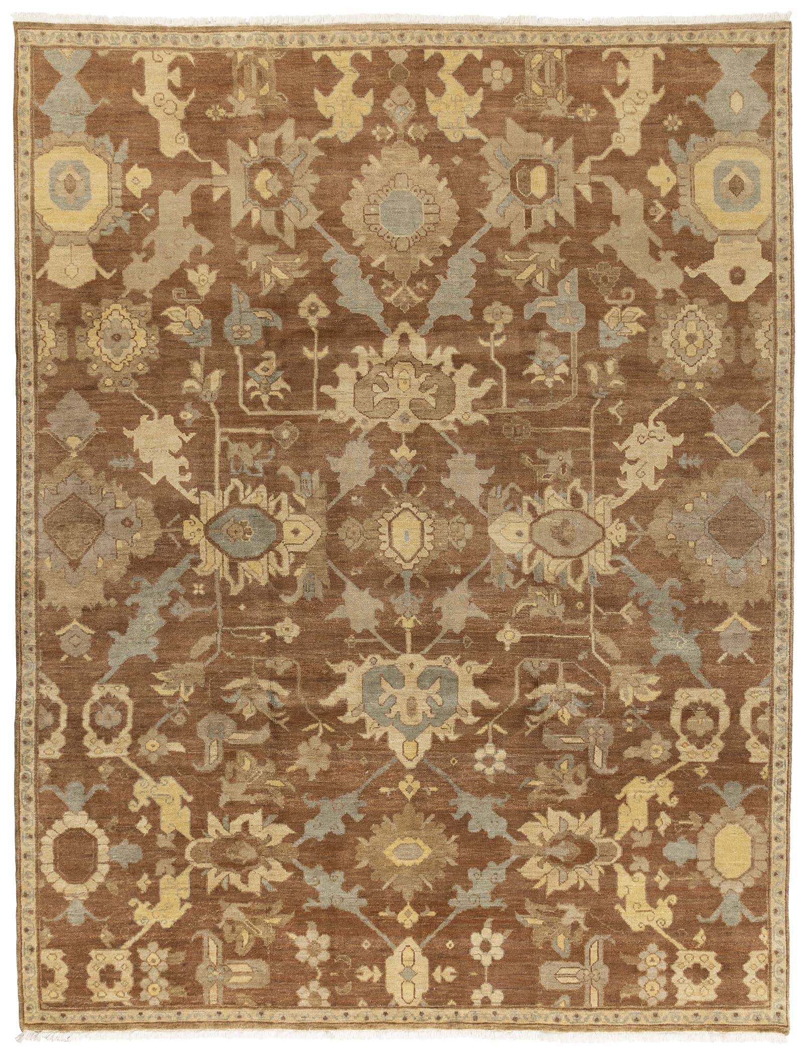 A borderless field of whimsical folk-inspired images barely contained by the smallest of trims, large and small details make this a carpet where you will discover new things every time you look at it. Hand knotted in Nepal of 100% wool, Rukesh Macchiato has brown, tan, taupe grey, and beige tones, and a pile height under 1/2 of an inch.
