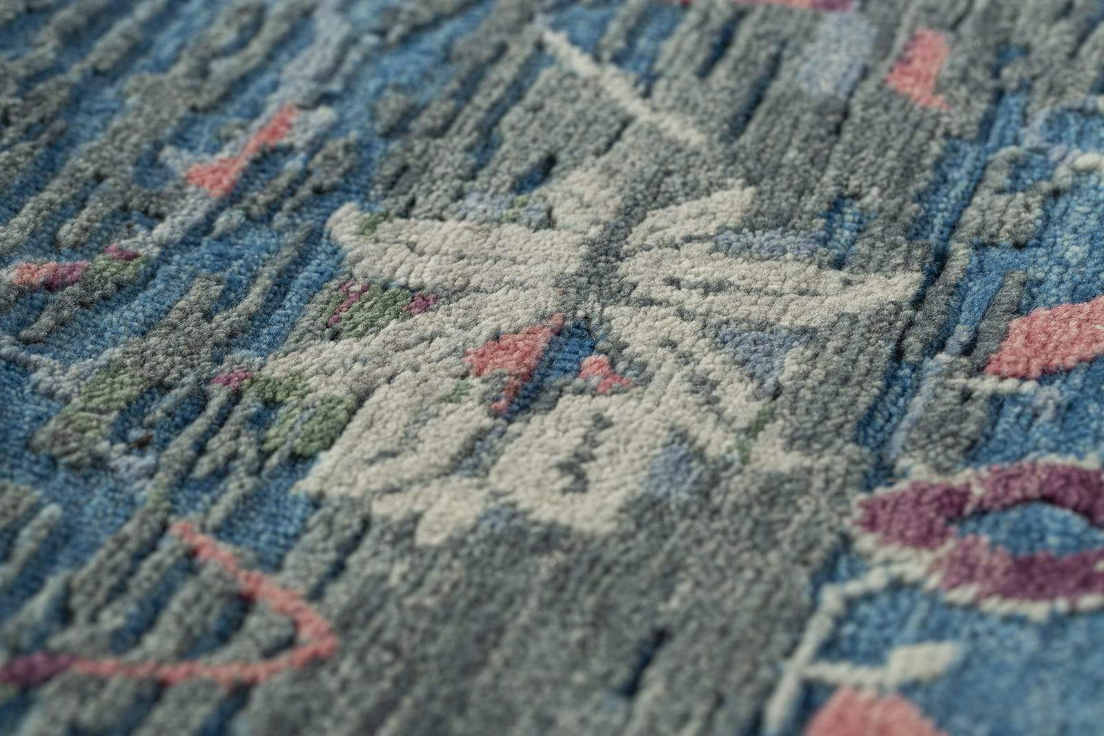 Drawing from an old Armenian pattern, this production sample features blues, greys, lavendar, pink, cream and soft moss. This one-of-a-kind piece measures approximately 4' x 6'.