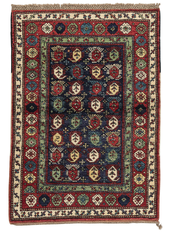 This boteh Armenian Kazak weave rug in a multicolored palette features a midnight blue field. It is adorned with boteh designs that cover the whole center field in colors of red, ivory, moss green, and blue, and it also features a thin, ivory border. It measures approximately 3' 1" x 5' 11" and is available for immediate delivery.