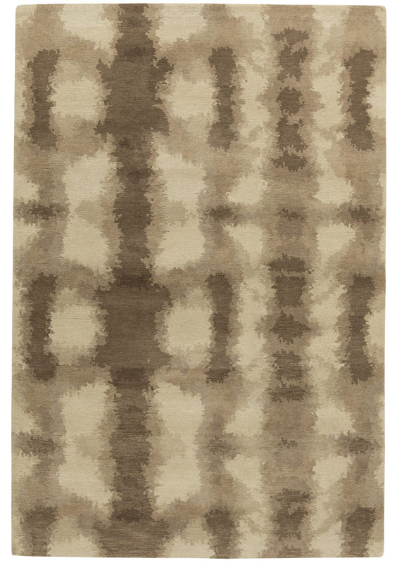 An amorphous pattern of taupes and beige is displayed in this 4x6 wool sample rug from India. A beautiful mix of neutral brown tones are woven into a shibori style pattern, making this a design that will coordinate with many design styles. This rug is hand knotted of Himalayan wool and made with our Shakti Weave which has a pile height under one half inch.
