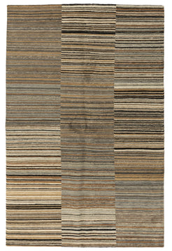 Spectrum III Tan is a sample in the 6x9 size that was handcrafted in Nepal of 100% Himalayan wool using our Timpa weave. The average pile height is under one half of an inch which offers an inviting comfort for any space. This rug features lively haberdasher stripes in a sophisticated grey, tan, golden brown and black palette. Spectrum is a rug that can establish a foundation in a room while offering harmonizing undertones. The Spectrum rug is well suited for high traffic areas because of the durable and stain resistant quality of the 100% wool construction.