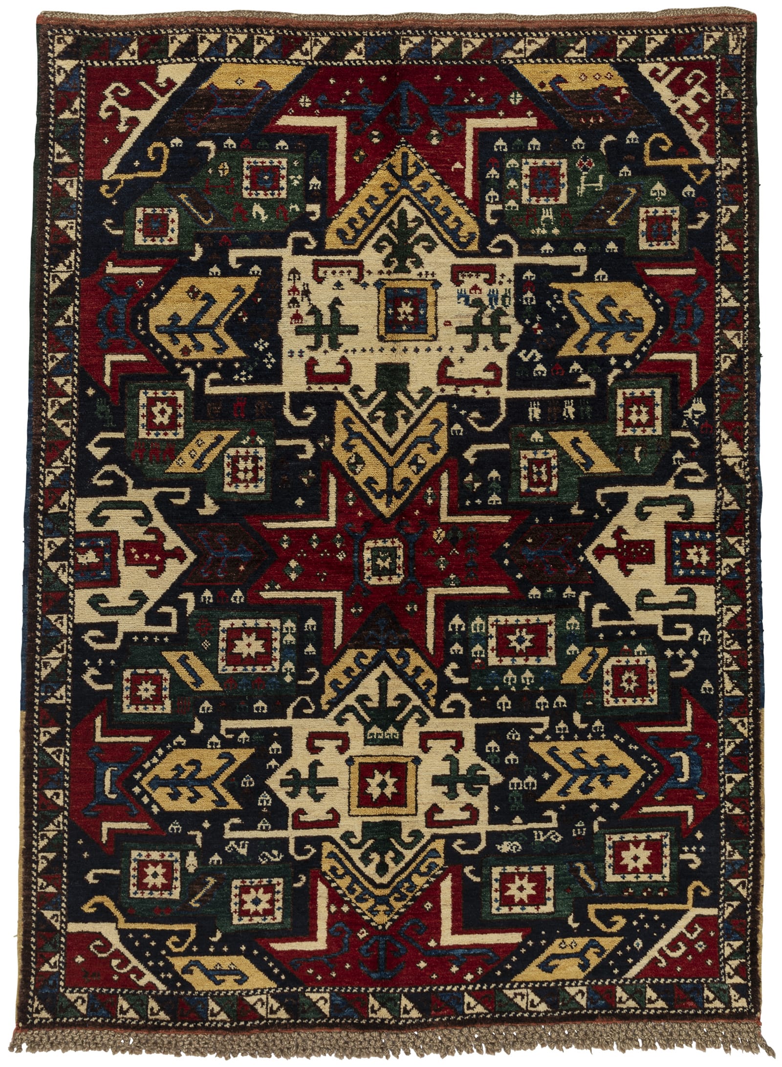This double star motif Armenian Kazak weave wool rug is rendered in a multi-color, energetic palette. This rug was hand-knotted of 100% Armenian wool using our Kazak weave which has a pile height around a third of an inch. The double star symbol is used to express happiness and fertility, and the colors used in this carpet are brick red, gold, ivory, emerald green and deep blue. Stark Kazak T04 measures approximately 6' by 7' and is available for immediate delivery from our New Jersey warehouse.