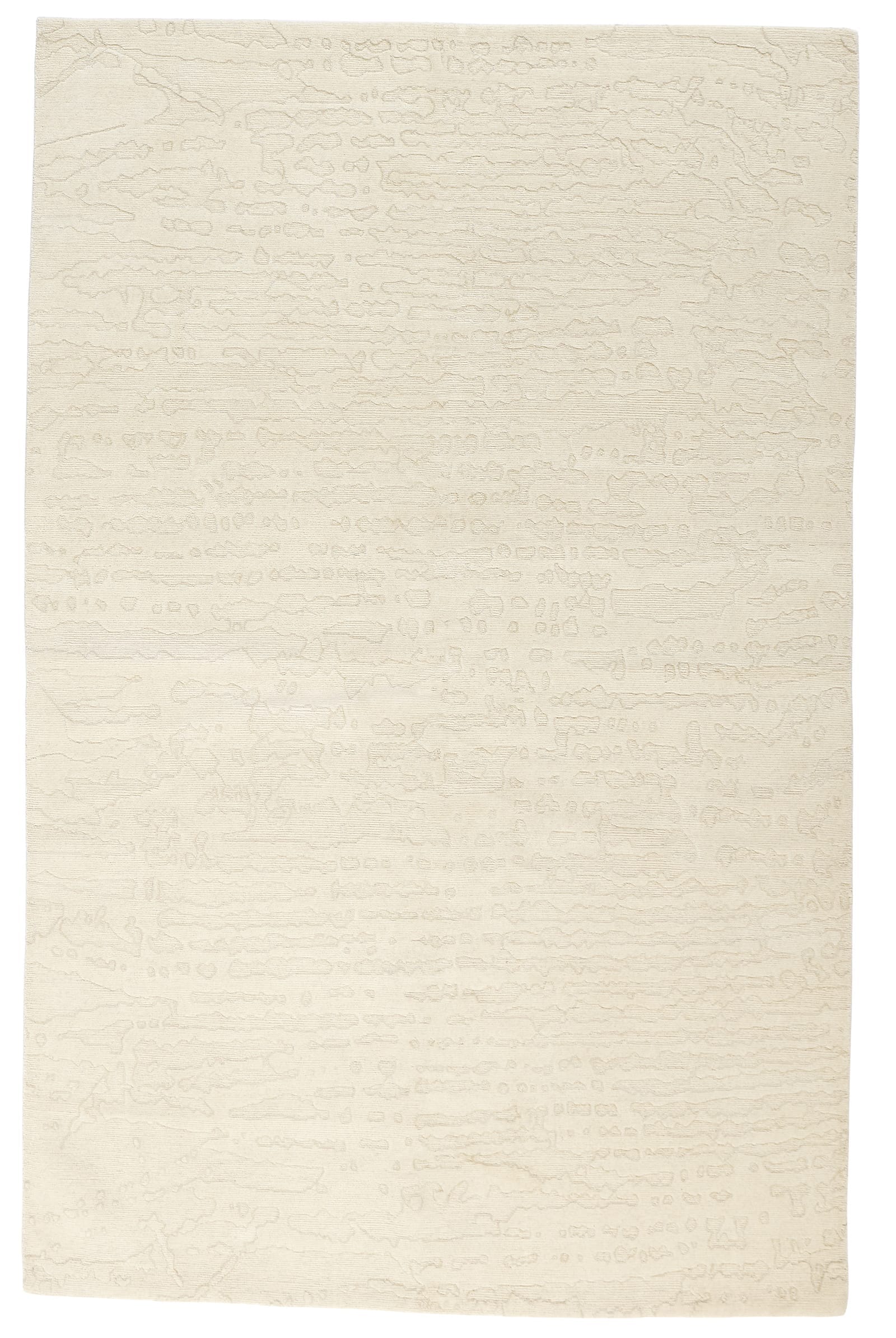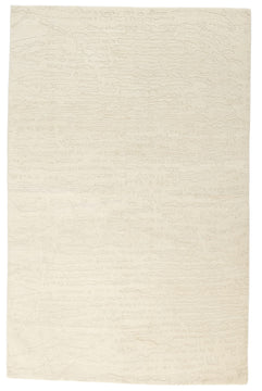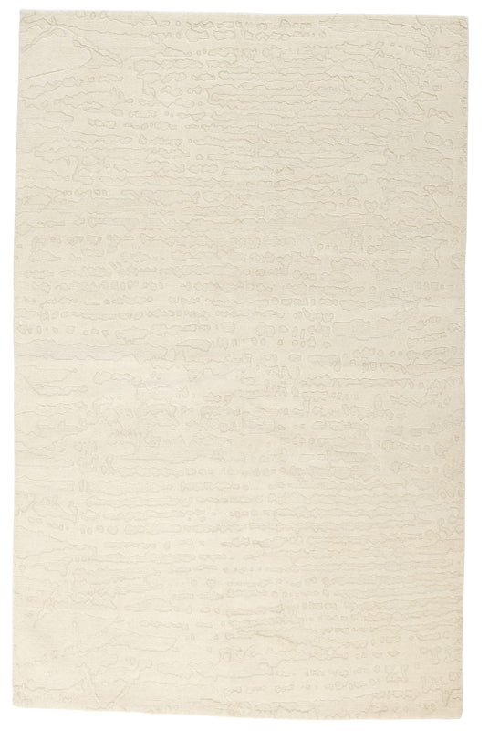 A graceful and cosmopolitan 6x9 rug in creamy whites. Modern, but possessing the wistful elegance of a bygone era. This one of a kind rug is only available as a 6x9, and was hand knotted of wool and silk in Nepal.