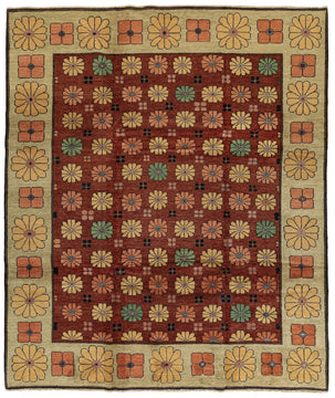 Tabriz S67 features an endearing bordered design ready to ground any room's decor. Stylized flowers are rendered in warm orange, yellows and greens on a crimson field, and the design features a burnished gold border. This one-of-a-king piece was hand-knotted in Armenia of 100% wool using our Tabriz weave. Tabriz S67 is a one of a kind design available only as an 8 x 10.