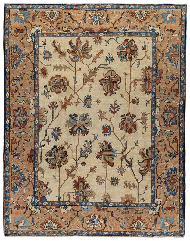 Tabriz TZ15 #124 features a bold traditional design in a warm color palette. Traditional motifs are rendered in light blues and rusty oranges on a warm, wheat colored field, surrounded by a thick, butterscotch colored border. This one-of-a-king piece was hand-knotted in Armenia of 100% wool using our Tabriz weave. Tabriz TZ-15 #124 is a one of a kind colorway available only as an 8 x 10.