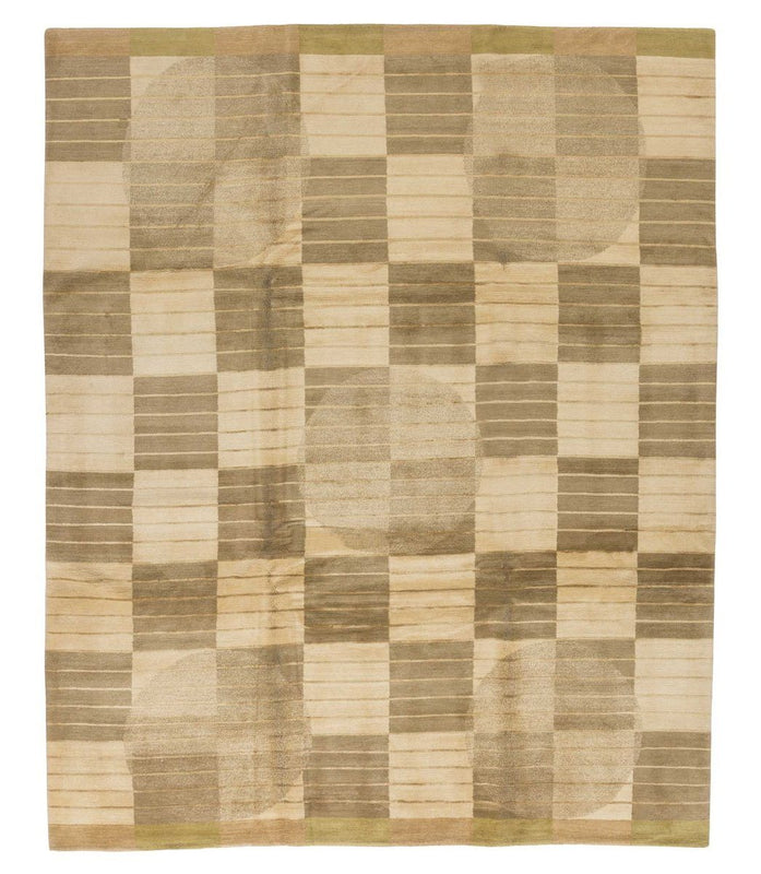 This modern style Tibetan Shakti rug features a checkerboard pattern in beige and light brown, with golden wheat pinstripes and light beige orbs. Hand knotted in Nepal of Himalayan wool and up to 10% silk using the Tufenkian Shakti weave, giving it a smooth finish and pile height of about 0.28 inches. This rug measures approximately 8' x 10'.