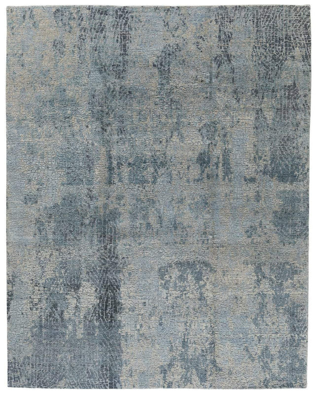 A beautiful and textural carpet that combines soft color, subtle design and artisan handcrafting. The soft blue palette is accentuated by a combination of high and low pile. Hand knotted of 100% wool, this one of a kind rug measures approximately 8' x 10'.