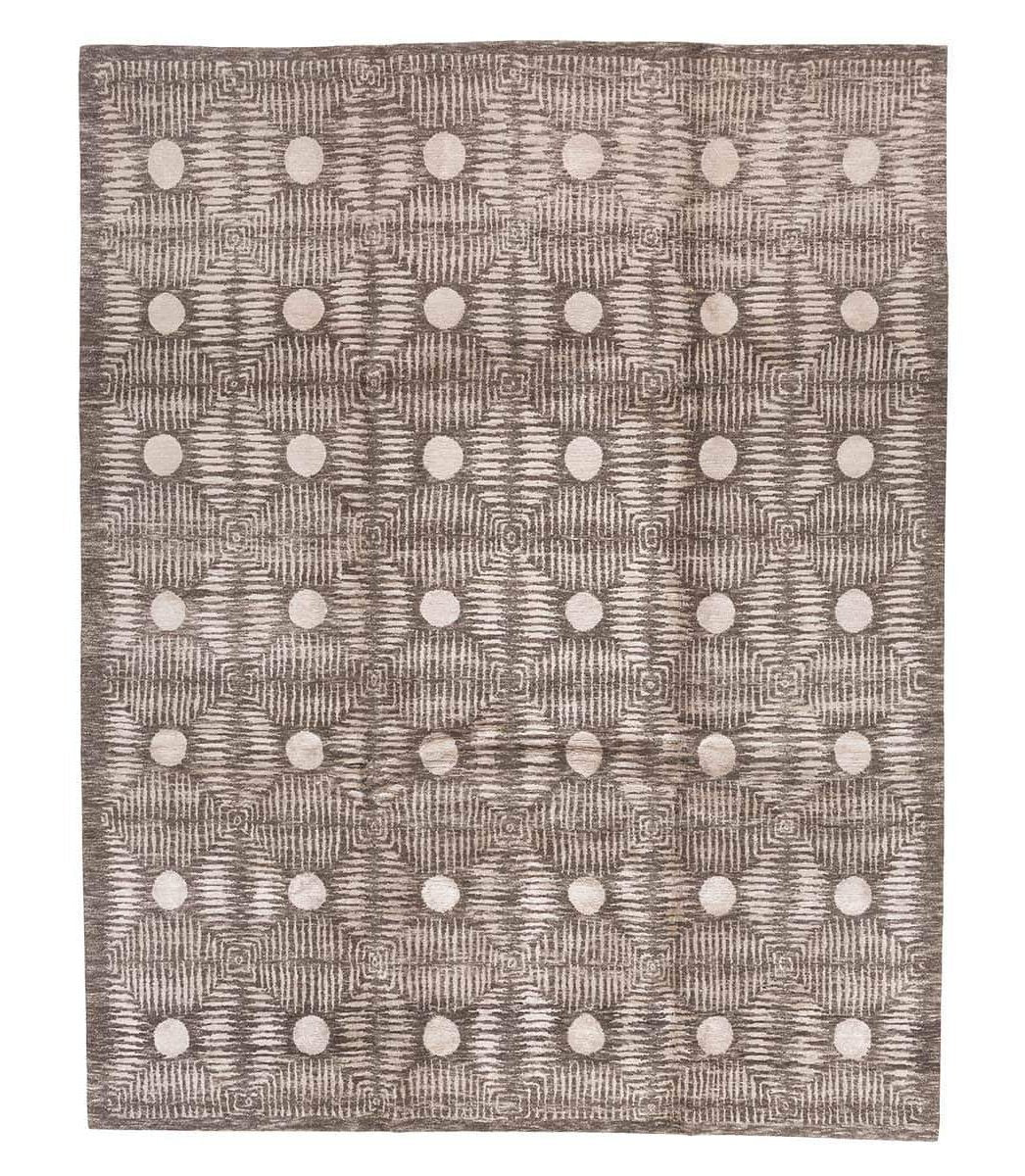 Hand knotted of wool and Tufenkian Bamboo Silk, this carpet measures approximately 8' x 10'. This rug contains about 45% bamboo silk, giving it an extremely smooth and soft finish, a lovely place to rest your feet! Crafted using our Shakti weave, this rug has a pile height under 1/3 of an inch. This one-of-a-kind sample was a color test for the popular Town Square design currently found in our Design Catalog.