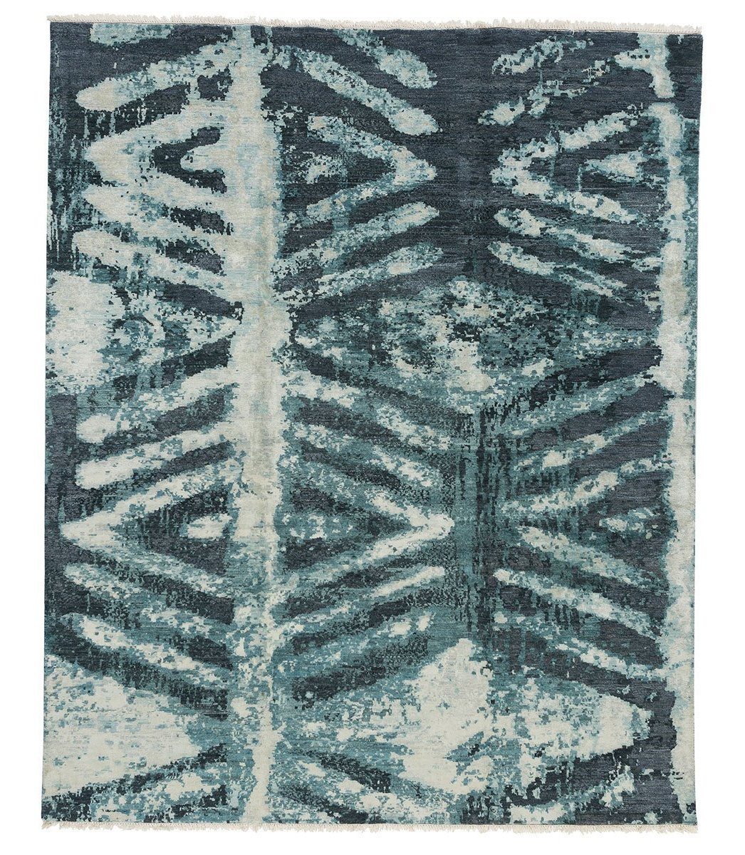 Originally part of our Made for the Trade Collection, the remaining 8x10 of Trinity Blue is now available as part of our Archive Sale selection. Hand knotted of wool and bamboo silk in India, this modern design plays well with a variety of styles and color palettes. This rug has a pile height under one half of an inch.