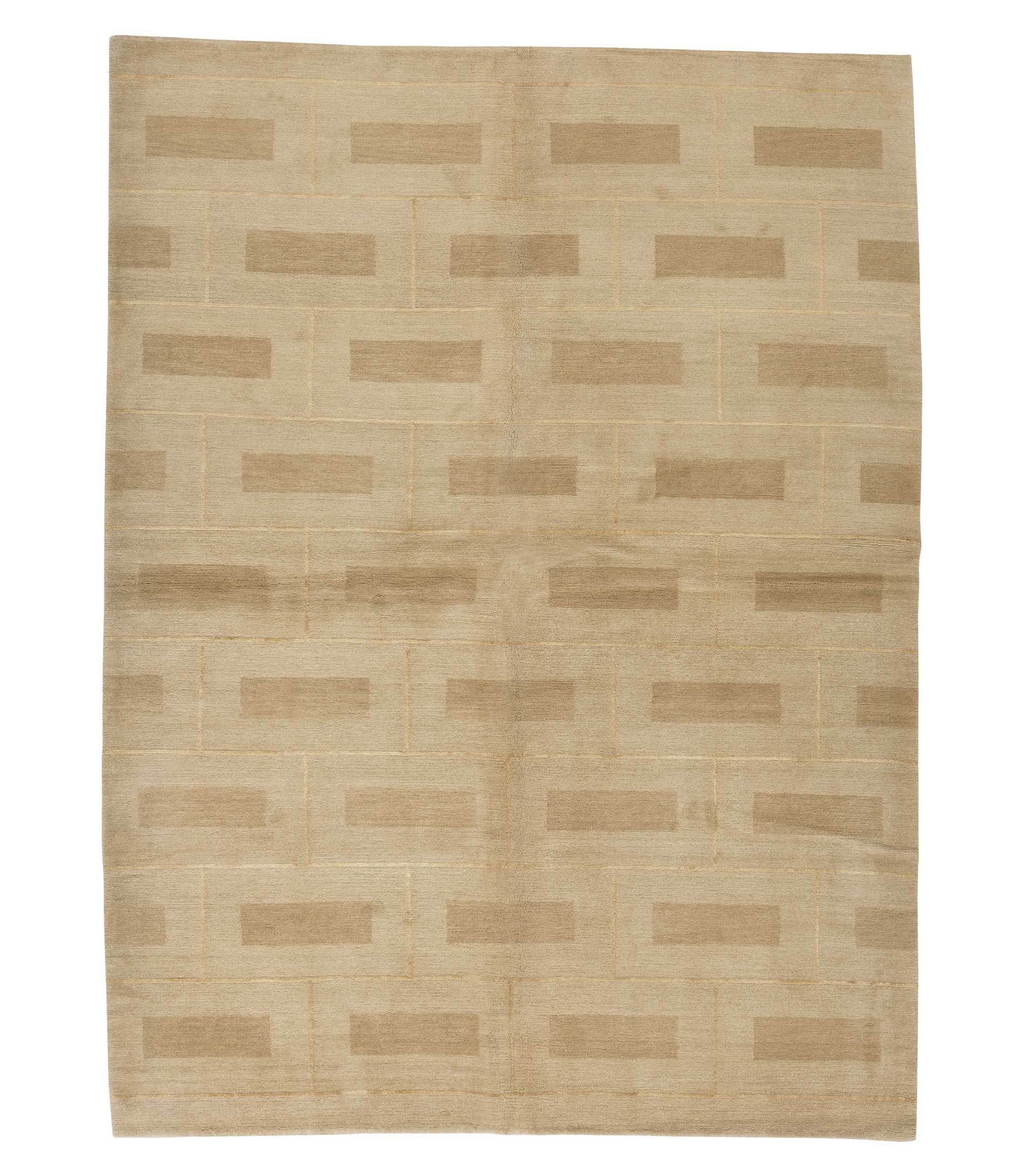 This neutral, geometric carpet was created in our Nepalese facilities by our artisan weavers. It was woven without using a design guide, using only the weaver's imagine and years of experience crafting carpets by hand. It was woven using Himalayan wool and silk and measures approximately 6' x 9'. It was made in our Shakti weave and as an approximate pile height of 0.28 inches.