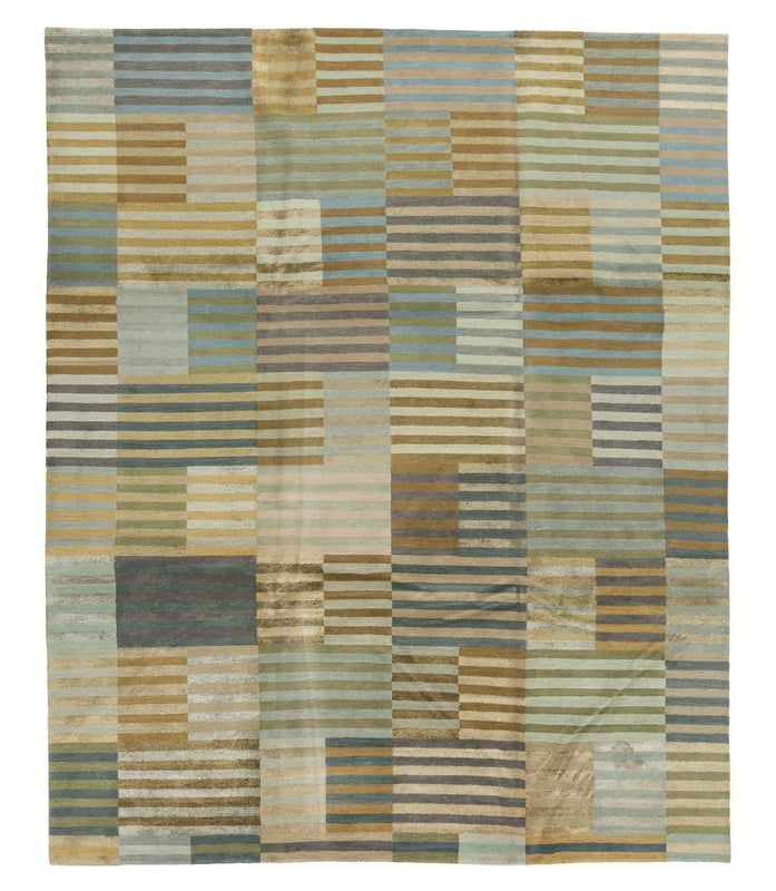 TUFENKIAN HAND KNOTTED TIBETAN RUG, SHAKTI, BLUE AND BROWN STRIPED