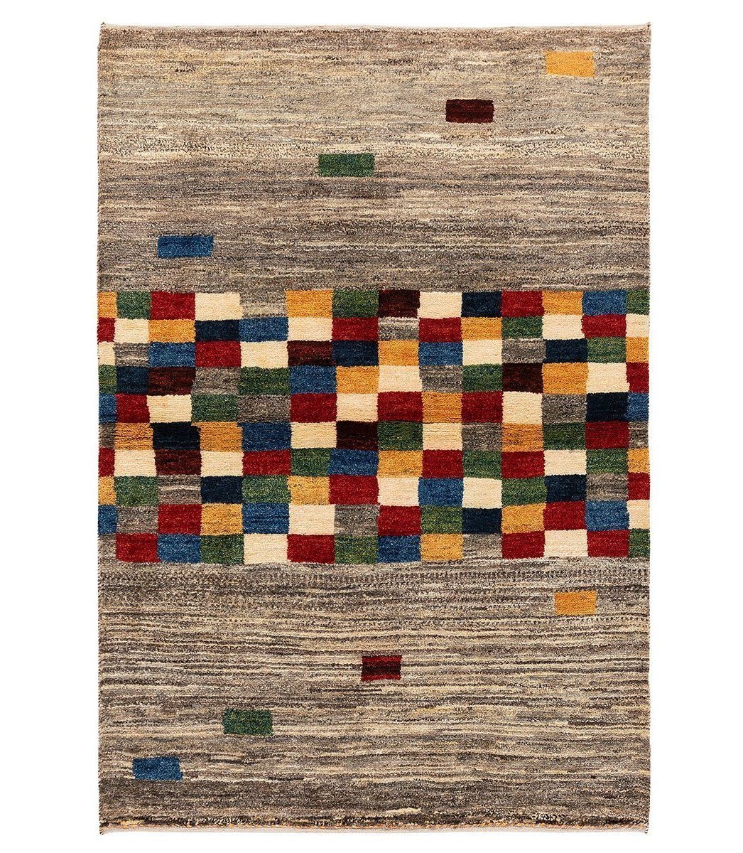 This one-of-a-kind multi-colored Persian gabbeh was hand knotted using 100% Persian wool and measures 3' 2" x 4' 7"