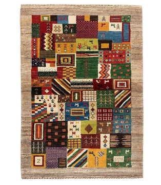 This one-of-a-kind hand knotted gabbeh rug measures 3' 3" x 4' 8", and was woven using vegetable dyed Persian wool.