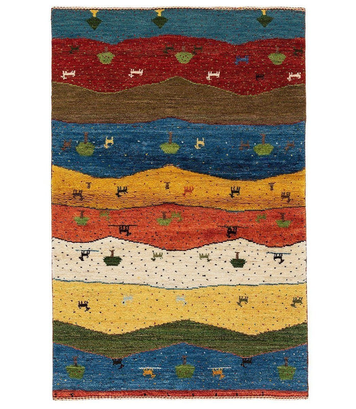 This one-of-a-kind Persian gabbeh was hand knotted using 100% Persian wool and measures 2' 12" x 4' 7".
